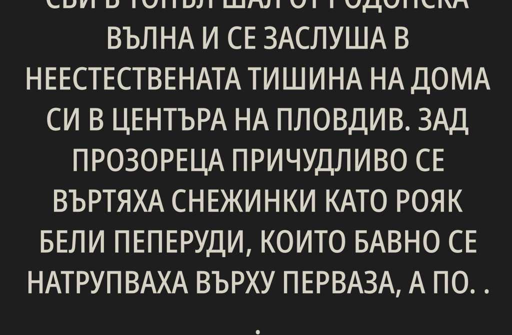 Валерия колебливо отключи. Владко стоеше на прага, преметнат през снега, а дрехите му капеха в кръг около вече размитата постелка. Не приличаше на себе си. Очите му горяха с уплашения син пламък на утрото над Балкана и размиваха формите на стаята.