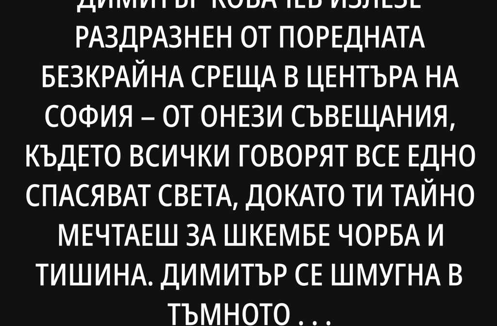 Милионерът-бизнесмен Димитър Ковачев излезе раздразнен от поредната безкрайна среща в центъра на София от онези съвещания, където всички говорят все едно спасяват света, докато ти тайно мечтаеш за шкембе чорба и тишина. Димитър се шмугна в тъмното си BMW, каза на шофьора да кара към дома, и започна да цъка нервно из телефона си, докато задръстването по Цариградско пълзеше с темпото на охлюв с махмурлук.
