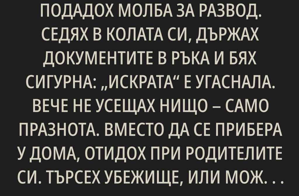 Седях в колата си, държах документите в ръка и бях сигурна: искрата е угаснала. Вече не усещах нищо само празнота.