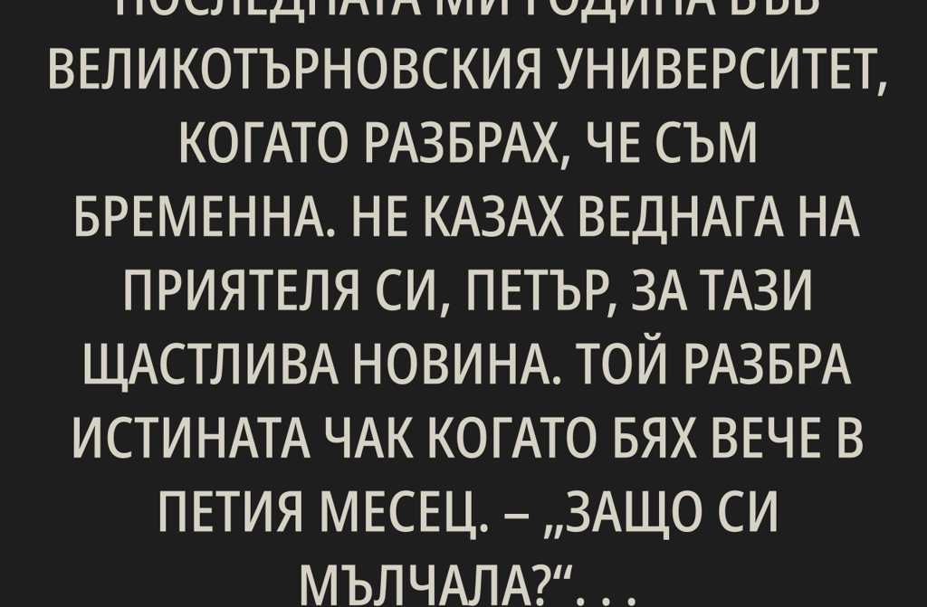 Беше последната ми година във Великотърновския университет, когато разбрах, че съм бременна. Не казах веднага на приятеля си, Петър, за тази щастлива новина. Той разбра истината чак когато бях вече в петия месец.