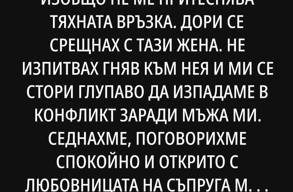 Съпругът ми има любовница. Изобщо не ме притеснява тяхната връзка. Дори се срещнах с тази жена. Не изпитвах гняв към нея и ми се стори глупаво да изпадаме в конфликт заради мъжа ми.
