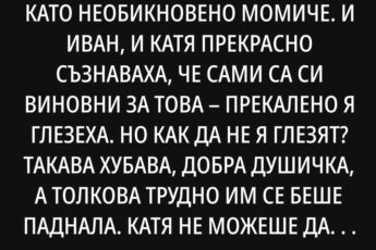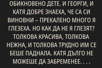 Сутринта започна както винаги. Още не беше съвсем светло, но градът вече се събуждаше. Отворих очи, протегнах се, погледнах мъжа до мен **Борис**. Беше заспал на гръб, ръката му увиснала от леглото, лицето спокойно като на дете. В такива моменти се опитвах да не мисля за последните кавги, за странната му отчужданост, за късните му връщания от работа с думите: Всичко е наред, просто имам много ангажименти. Исках да му вярвам. Исках всичко да е наред.
