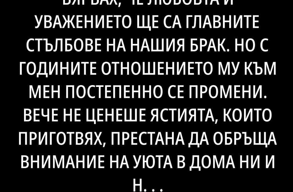 Когато се омъжих за Димитър, вярвах, че любовта и уважението ще са главните стълбове на нашия брак. Но с годините отношението му към мен постепенно се промени. Вече не ценеше ястията, които приготвях, престана да обръща внимание на уюта в дома ни и на всяка възможност пускаше саркастични забележки по мой адрес.