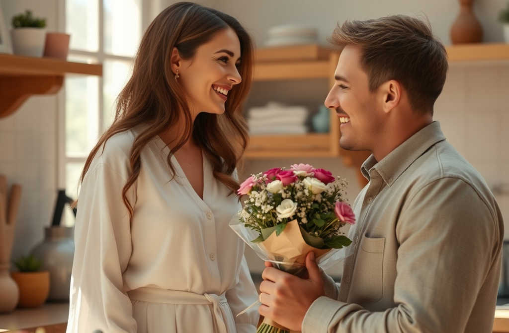 Тя взема букета машинално. Дори и да му е симпатично, тя остава подозрителна.