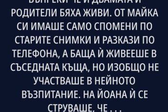 Мъжът отвори вратата и пред него стоеше непозната старица с избелели коси и фрагментиран поглед, в който проблясваше страх. Лицето й му беше до болка чуждо, но в същото време познато, както са лицата от забравени сънища.