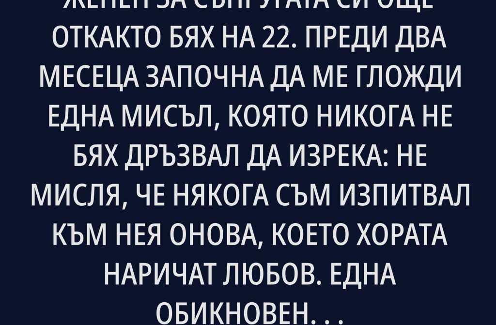 Аз съм на 41 години и съм женен за съпругата си още откакто бях на 22. Преди два месеца започна да ме гложди една мисъл, която никога не бях дръзвал да изрека: не мисля, че някога съм изпитвал към нея онова, което хората наричат любов. Една обикновена вечер, седях на дивана в хола, гледах новините по БНТ и се запитах защо не съм усещал това, което другите мъже описват като “пеперуди в стомаха”, тръпка, желание да я прегърна още щом я видя. Замислих се и нещата малко по малко започнаха да се подреждат.