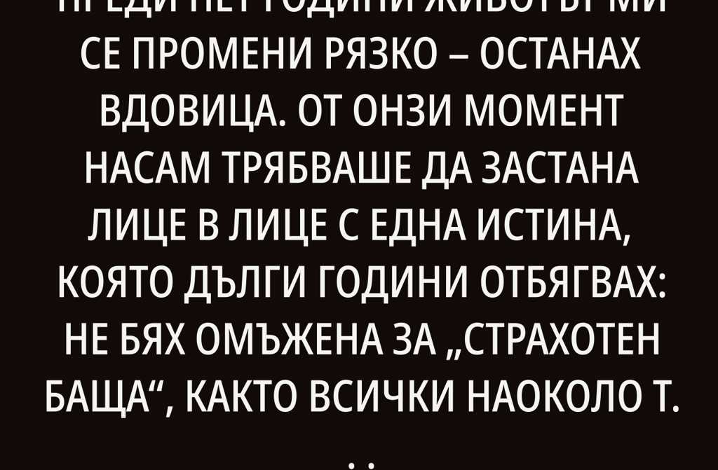 Пиша всичко това, защото скръбта понякога е не само болка, но и равносметка. Обръщане назад и приемане на неща, които десетилетия си отричал. Аз приеx: бракът ми не беше приказният идеал. Беше стабилен, подреден, привидно щастлив. Но ми отне гърба, ума, съня и остави в мен празнина, която никой не видя, защото аз все пак изглеждах добре.