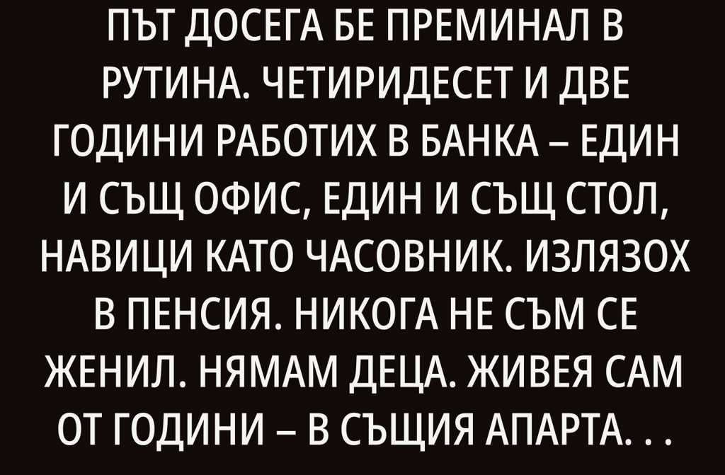 На 67 години съм. Целият ми път досега бе преминал в рутина. Четиридесет и две години работих в банка един и същ офис, един и същ стол, навици като часовник. Излязох в пенсия. Никога не съм се женил. Нямам деца. Живея сам от години в същия апартамент в София, който наех като бях на 28.