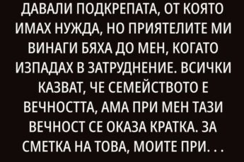 — „На тази маса място нямаш. Ти трябва да ни обслужваш!“ — думите на свекърва ми още кънтят в ушите ми Сутрин в кухнята при свекърва ми — по нощница, с разрошена коса, аромат на препечени филийки и силно българско кафе. Дъщеря ми на 7 рисува шарени спирали с флумастер, а аз въртя яйца и се чудя дали моите диетични хлебчета ще минат между „правилата“. Свекърва ми влиза — каменно лице, строг тон: „Можеш ли да готвиш нормално, не по твоите модерни приумици?“ Мъжът ми — „Ще поживеем при мама, само за два месеца. Близо е до работа, ипотеката е пред одобрение.“ В една кухня с две силни жени — всеки сантиметър ми напомня: „Ти си гост.“ Контрол, ред и морал — тя диктува всяка сутрин. Детето ми — твърде шумно. Моите навици — излишни. Моето мнение — незначително. Вечер, две вечери: по-български, без лук, или с лук, само в нейния тиган. Докато един ден, гости и приятелки на свекърва ми — „Ти ще ни обслужваш.“ Подавай чай, събирай чинии, усмихвай се и мълчи. „Така е, когато има млада домакиня за подръжка!“ Вечер казвам истината: „Аз повече така не мога. Живеем като чужди, невидима съм.“ Потърсихме квартира още същия ден. Малък апартамент, стари мебели, скърцащ балатум — но моят дом, моят глас, нашите правила, наше утро с българска музика и смях. ❓А ти как мислиш — щеше ли да издържиш „за малко“, или би си тръгналa още в първата седмица?