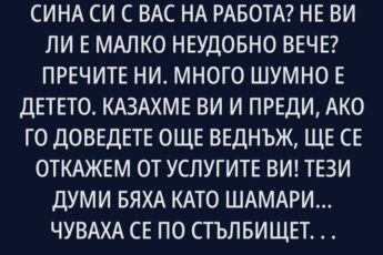 А всичко започна толкова невинно. След сватбата ние със Сашо се нанесохме при майка му в Плевен, в двустайния й апартамент. Опитвах се да съм учтива, да не възразявам, да помагам в домакинството. Отначало всичко вървеше гладко — без кавги, без гърмежи. Свекървата не придирваше, само понякога ме упрекваше, че не почиствам праха както трябва или че пера хавлиите на грешната температура. Но това са дреболии, нали?