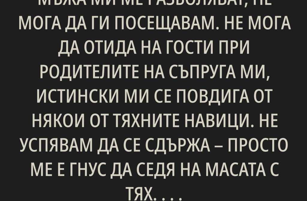 Не мога да отида на гости при родителите на съпруга ми, истински ми се повдига от някои от тяхните навици. Не успявам да се сдържа просто ме е гнус да седя на масата с тях. Готова съм да говоря с тях, но не и да седна да ям заедно. За съпруга ми това е странно, а свекърва ми ме мисли за глезана или някаква принцеска, която все се изказва.