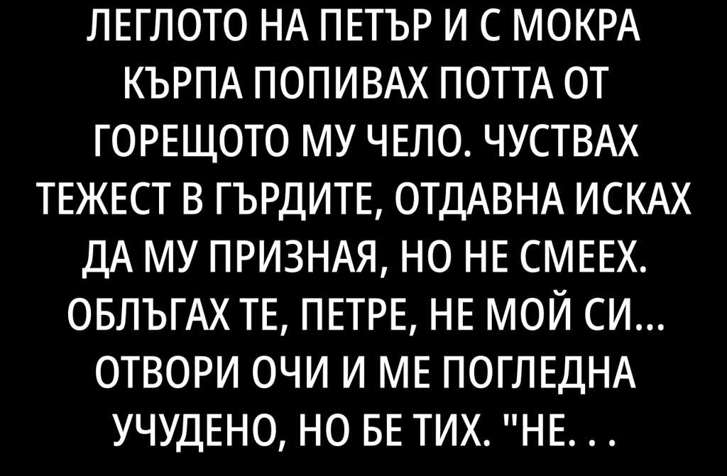 Седях край леглото на Петър и с мокра кърпа попивах потта от горещото му чело. Чуствах тежест в гърдите, отдавна исках да му призная, но не смеех. Облъгах те, Петре, не мой си…