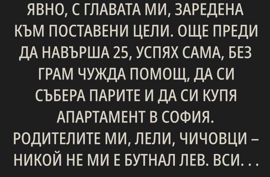 Бях невероятно късметлийка, явно, с главата ми, заредена към поставени цели. Още преди да навърша 25, успях сама, без грам чужда помощ, да си събера парите и да си купя апартамент в София.