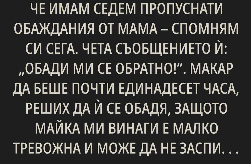 Излизам от салона и виждам, че имам седем пропуснати обаждания от мама спомням си сега. Чета съобщението ѝ: Обади ми се обратно!. Макар да беше почти единадесет часа, реших да ѝ се обадя, защото майка ми винаги е малко тревожна и може да не заспи нощем заради някакви дребни неща. Когато влязох при нея, тя ме посрещна със сълзи в очите и ми каза, че се е случило нещо сериозно може би сватбата ще бъде отменена.