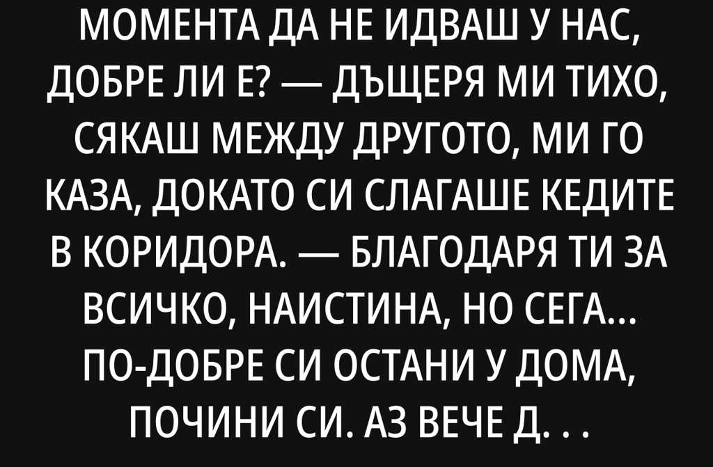 Извинявай, мамо, по-добре е в момента да не идваш у нас, добре ли е? дъщеря ми тихо, сякаш между другото, ми го каза, докато си слагаше кедите в коридора. Благодаря ти за всичко, наистина, но сега по-добре си остани у дома, почини си.