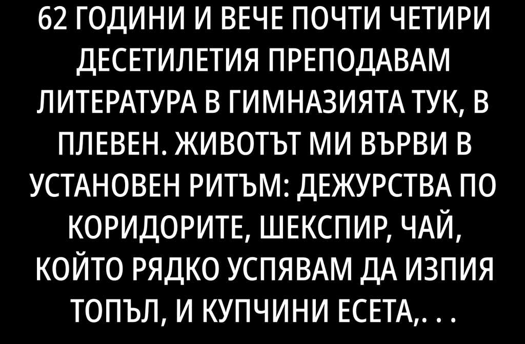 Аз съм на 62 години и вече почти четири десетилетия преподавам литература в гимназията тук, в Плевен. Животът ми върви в установен ритъм: дежурства по коридорите, Шекспир, чай, който рядко успявам да изпия топъл, и купчини есета, които никога не свършват.
