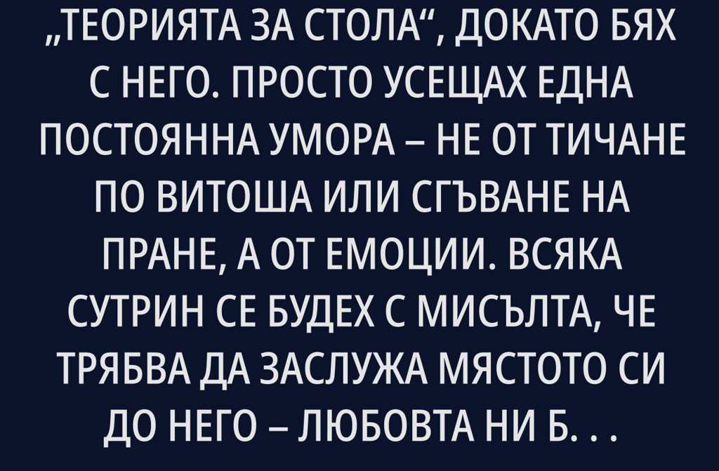 Не подозирах, че съществува теорията за стола, докато бях с него. Просто усещах една постоянна умора не от тичане по Витоша или сгъване на пране, а от емоции. Всяка сутрин се будех с мисълта, че трябва да заслужа мястото си до него любовта ни беше като матура по литература, само дето никога не ме пускаха да преписвам.