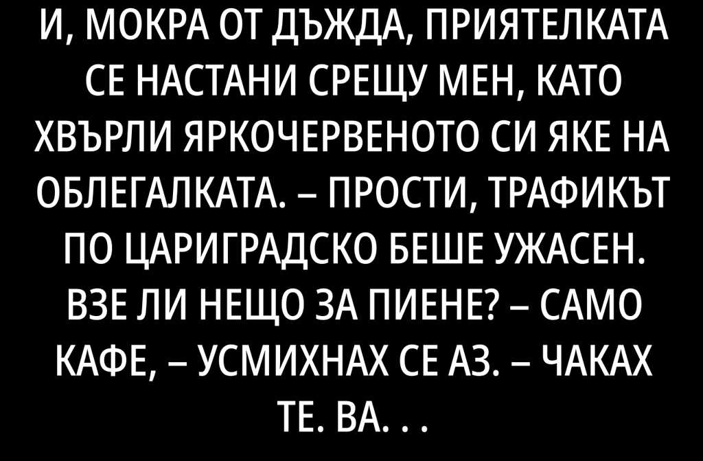 Даниела! извика познат глас и, мокра от дъжда, приятелката се настани срещу мен, като хвърли яркочервеното си яке на облегалката. Прости, трафикът по Цариградско беше ужасен. Взе ли нещо за пиене?