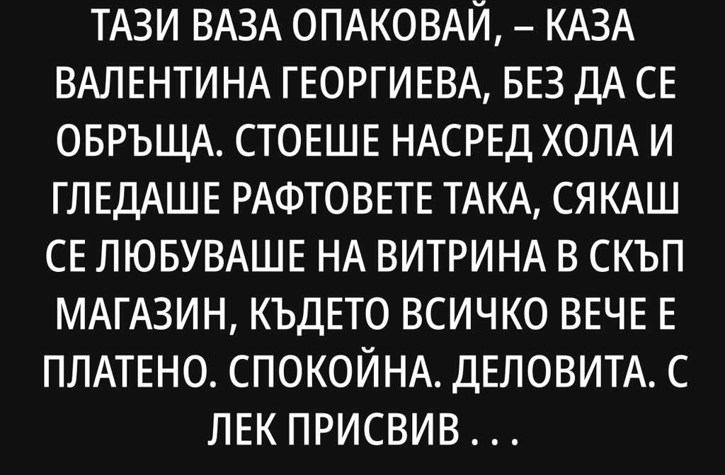И тази ваза опаковай, каза Валентина Георгиева, без да се обръща.