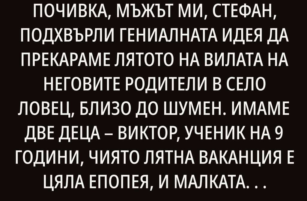 Ден преди дългоочакваната почивка, мъжът ми, Стефан, подхвърли гениалната идея да прекараме лятото на вилата на неговите родители в село Ловец, близо до Шумен. Имаме две деца Виктор, ученик на 9 години, чиято лятна ваканция е цяла епопея, и малката Десислава, сладък бебок на 7 месеца, която би се чувствала безкрайно по-добре на чист въздух, а не в задушния град, където жегата се лее като компот през август. Стефан ме увери с патос, че родителите му баба Венета и дядо Кольо никога няма да се разсърдят, ще са на седмото небе да се мотат с внучетата, а като едни царски глави даже знаят колко е трудно с малки деца и изобщо няма да ни претендират с негови думи някакви глупости.