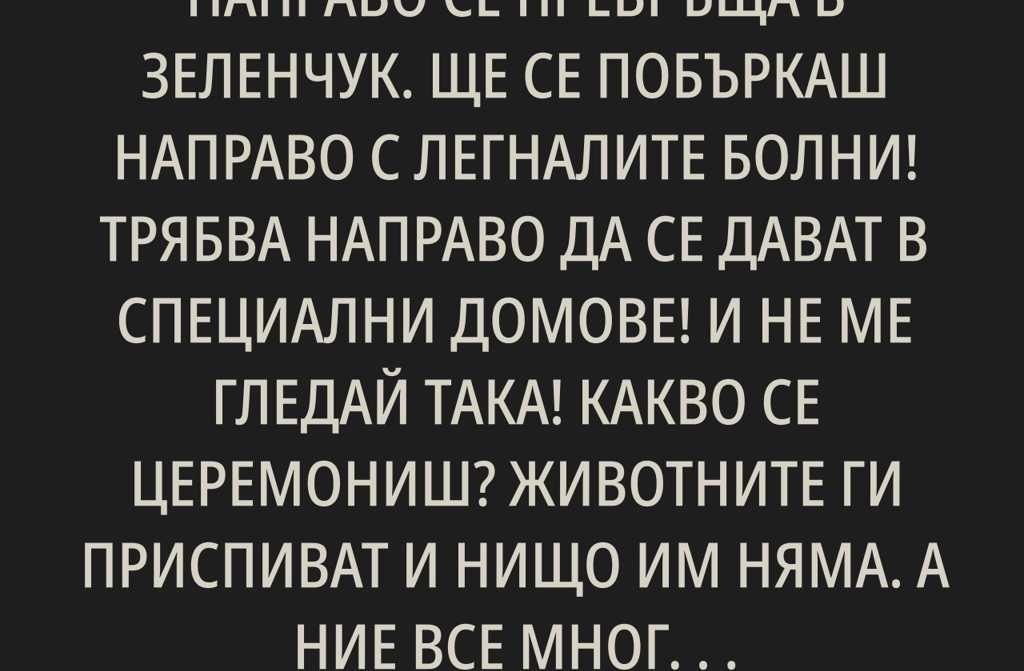 – Еее, аз така не бих могла. Човек направо се превръща в зеленчук. Ще се побъркаш направо с легналите болни! Трябва направо да се дават в специални домове! И не ме гледай така! Какво се церемониш? Животните ги приспиват и нищо им няма. А ние все много хуманни. Пък в някои страни възрастните ги качват на някой връх и там ги оставят. А има още… започна пак Антония, но Люба я прекъсна: