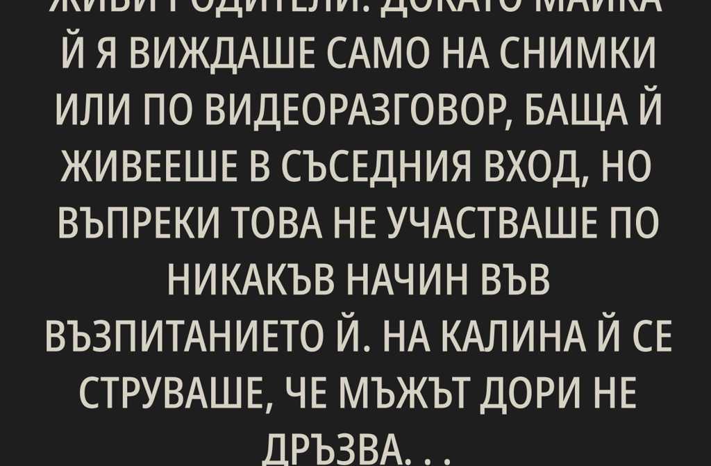 Децата са щастие, нейното щастие а щастието, както е казано, никога не е в излишъкТези дни, когато нощите бяха дълги и тишината над селската къща се разливаше като тънка мъгла, Калина чуваше тихото дишане на бебето и първите неспокойни сънища на малкия си син. Гушвайки ги, усещаше как топлината на телата им се преплита в едно крехко семейство, родено на пепелта на разочарованията. Време бе да обърне гръб на това, което не получила, и да даде на децата си онова, което самата тя бе търсила цял живот обич без условия.