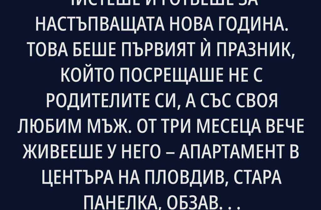 Цял ден Елена се суетеше, чистеше и готвеше за настъпващата Нова година. Това беше първият ѝ празник, който посрещаше не с родителите си, а със своя любим мъж.