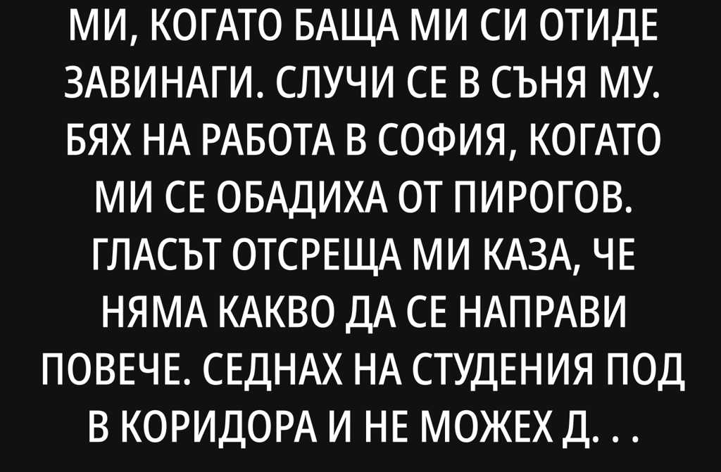 Оставаха осем дни до сватбата ми, когато баща ми си отиде завинаги. Случи се в съня му. Бях на работа в София, когато ми се обадиха от Пирогов. Гласът отсреща ми каза, че няма какво да се направи повече. Седнах на студения под в коридора и не можех да разбера как да реагирам. Майка ми си беше отишла още преди години баща ми беше всичко, което ми остана. Жената, която помагаше при него баба Златка го намерила, понеже имаше ключ.