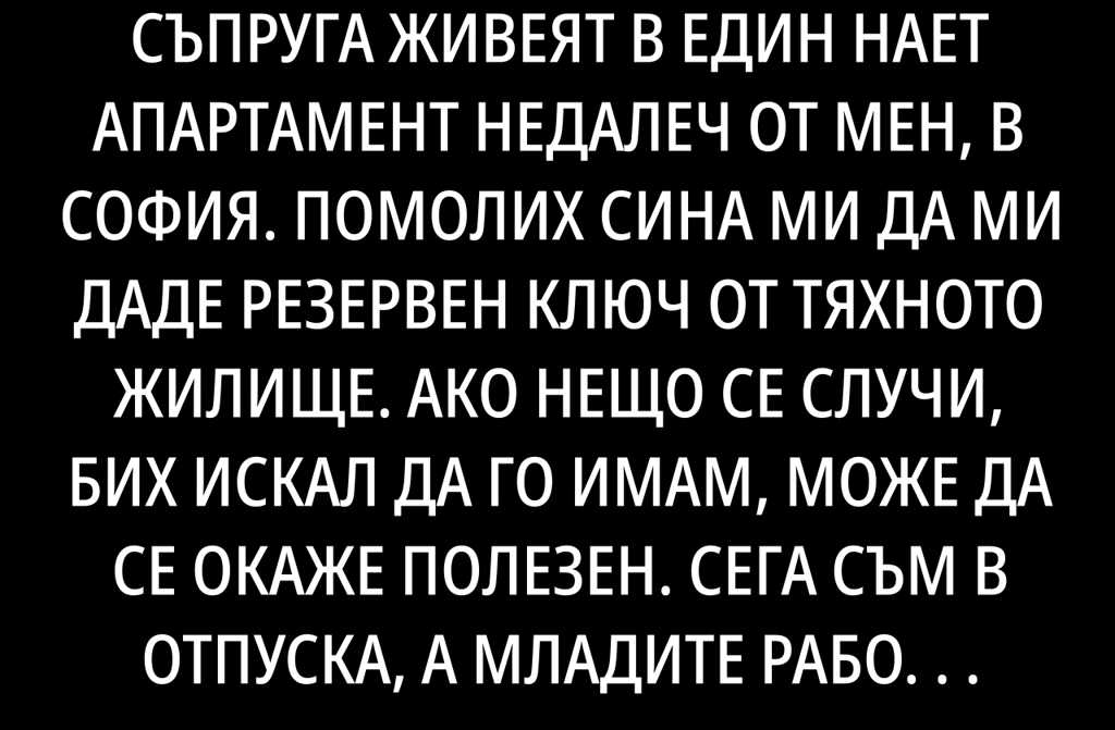 Синът ми и неговата млада съпруга живеят в един нает апартамент недалеч от мен, в София. Помолих сина ми да ми даде резервен ключ от тяхното жилище. Ако нещо се случи, бих искал да го имам, може да се окаже полезен. Сега съм в отпуска, а младите работят.