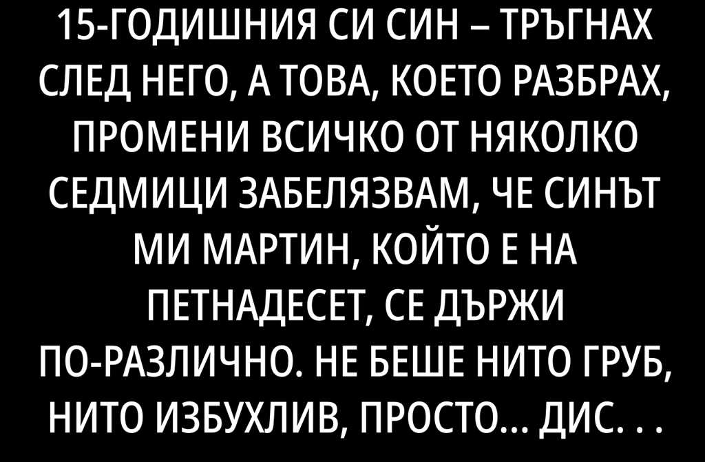 От няколко седмици забелязвам, че синът ми Мартин, който е на петнадесет, се държи по-различно. Не беше нито груб, нито избухлив, просто… дистанциран. Връщаше се уморен след училище в Пловдив, веднага влизаше в стаята си и затваряше вратата. Ядеше по-малко и изглеждаше, че се стряска всеки път, когато го попитах къде отива или с кого си пише. Предположих, че може би е влюбен или преминава през някаква тийнейджърска драма неща, които децата се опитват сами да преживеят.