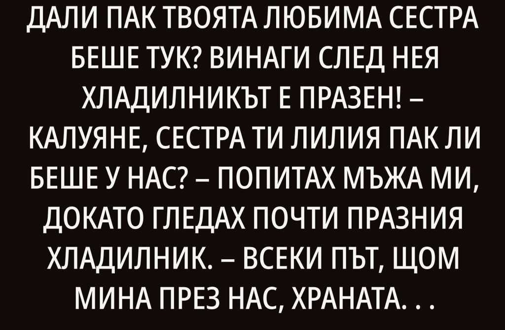 Калуяне, сестра ти Лилия пак ли беше у нас? попитах мъжа ми, докато гледах почти празния хладилник. Всеки път, щом мина през нас, храната сякаш потъва вдън земя.