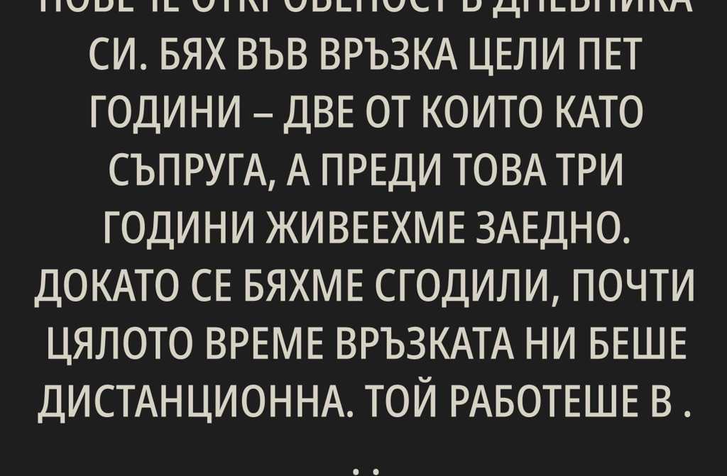 Днес си позволявам малко повече откровеност в дневника си. Бях във връзка цели пет години две от които като съпруга, а преди това три години живеехме заедно. Докато се бяхме сгодили, почти цялото време връзката ни беше дистанционна. Той работеше в Пловдив, а аз бях във Варна. Виждахме се веднъж на два-три месеца, а в една година се видяхме само два пъти заради ужасно натоварения му график. Тогава изобщо не ми тежеше напротив, струваше ми се, че така поддържаме жив огъня между нас. Липсвахме си, плачехме си по телефона, любовта ни бликаше в дълги съобщения и нощни разговори по Viber. Нямаше конфликти, нямаше ревност. И двамата ценяхме личната си свобода той излизаше на биричка с приятели, аз ходех по женски вечери или бях на караоке. Дори му допадаше да ми дава мнение какво да облека казваше ми, ако някоя дреха не ми подхожда, предлагаше ми други. Никога не показа признак на контрол. Даже изглеждаше горд, че съм до него. Всичко беше хармонично и спокойно идеално, поне така си мислех.