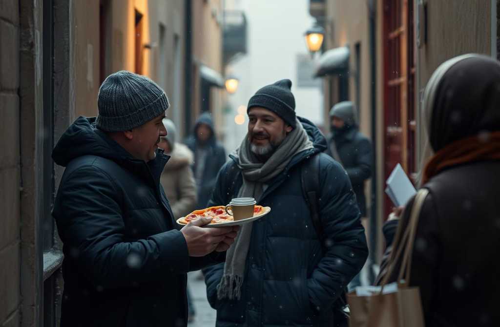На следващия ден, минавайки покрай същото заведение, неволно потърсих очите му. Но картонката беше празна – той изчезна. Минаха седмици, историята започна да избледнява в сивото на всекидневието. А после звъннаха на вратата. На прага стоеше мъж в спретнато облекло, с подстригана коса и познати очи. „Не ме познаваш?” – попита с лек усмив. Останах изгубен, ровейки се в спомените, но той подсказа: „Срещнахме се пред кафенето… купи ми пица онази вечер.” И тогава разбрах – беше той, същият бездомен, но сега прероден, жив.