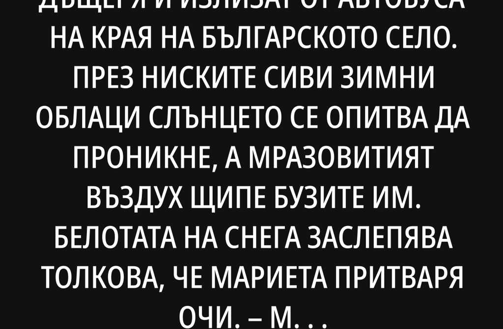 По-родно нямаВ градския автобус Мариета заспива на рамото на Варвара, а през прозореца снежните полета пробягват като бавна приказка. Варвара стиска ръката на дъщеря си. Светът ѝ се е обърнал, но сърцето ѝ вече тупти спокойно. Премисля за всичко онова, което е получила не името, не кръвта, а грижата, топлината, ежедневната любов. Колко ли още като нея израснали по чужди ръце, и какво значение има кой е дал живота ти, ако някой друг те е научил да обичаш, да прощаваш и да се връщаш у дома?