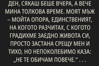 Една такава седмица ме изтощи дотам, че вечер коленете ми трепереха, а мозъкът не смогваше да подреди мислите си. Изчаках Стоянка да заспи в детската, затворих внимателно вратата и седнах на леглото при Данчо.