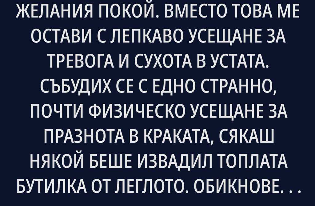 Следобедната дрямка не донесе желания покой. Вместо това ме остави с лепкаво усещане за тревога и сухота в устата. Събудих се с едно странно, почти физическо усещане за празнота в краката, сякаш някой беше извадил топлата бутилка от леглото. Обикновено Боби, моят златист ретривър, спеше точно там и тежкото му, ритмично дишане ме приспиваше по-сигурно и от всякакви хапчета.
