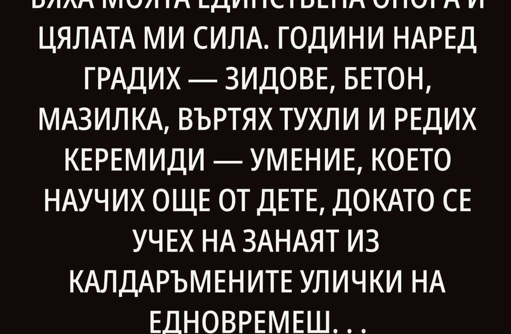 Преди много години, ръцете ми бяха моята единствена опора и цялата ми сила. Години наред градих зидове, бетон, мазилка, въртях тухли и редих керемиди умение, което научих още от дете, докато се учех на занаят из калдаръмените улички на едновремешна Варна.