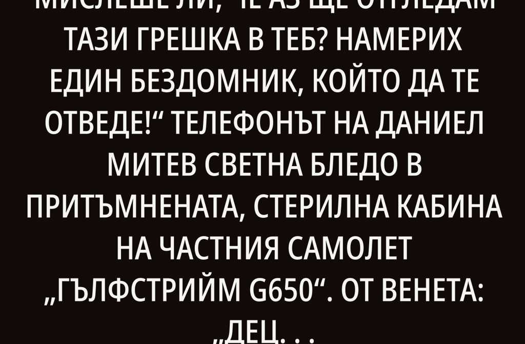 Телефонът на Даниел Митев светна бледо в притъмнената, стерилна кабина на частния самолет Гълфстрийм G650.