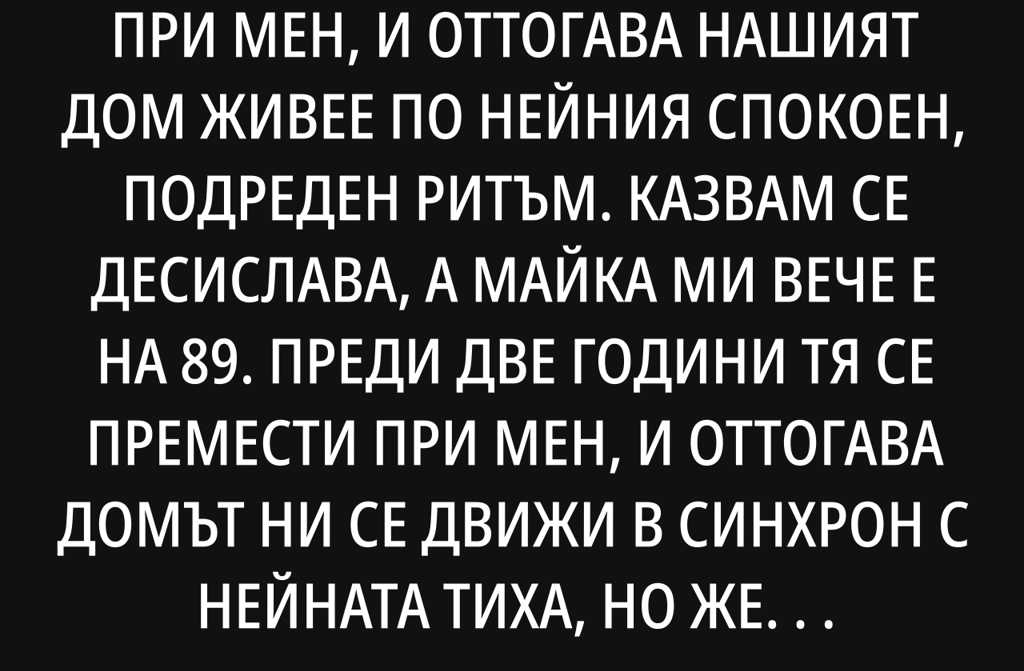 Казвам се Десислава, а майка ми вече е на 89. Преди две години тя се премести при мен, и оттогава домът ни се движи в синхрон с нейната тиха, но желязна дисциплина. Всяка сутрин, към седем и половина, чувам как се изправя от леглото, разговаря нежно с нашата възрастна, 23-годишна котка Мърко, и го храни с такава грижа, сякаш е малко дете.