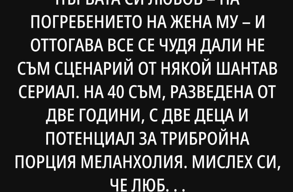 Преди седмица пак срещнах първата си любов на погребението на жена му и оттогава все се чудя дали не съм сценарий от някой шантав сериал. На 40 съм, разведена от две години, с две деца и потенциал за трибройна порция меланхолия. Мислех си, че любовните ми истории са прибрани в архив с папка, хартия и печат Завинаги. Е, явно има истории, които се правят на затворени, а всъщност само са си взели отпуск.