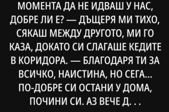 – Борко, – обърна се към него Румяна, – кажи на баща ти, че нормалните хора на наша възраст не се местят ей така!