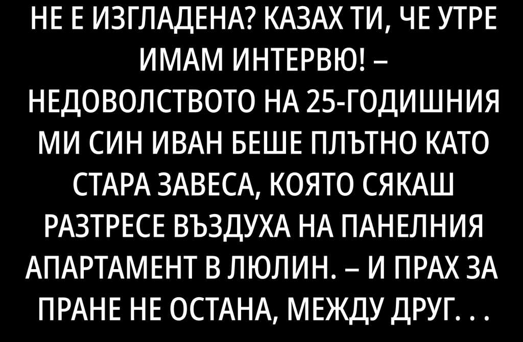 Иван влезе по боксерки, с корем нагоре, макар денят да привършваше. Мамо, престани. Виж ме, не мога да ида на интервю смачкан! Ти си знаеш не мога с ютия, все стрелките ми грешни.
