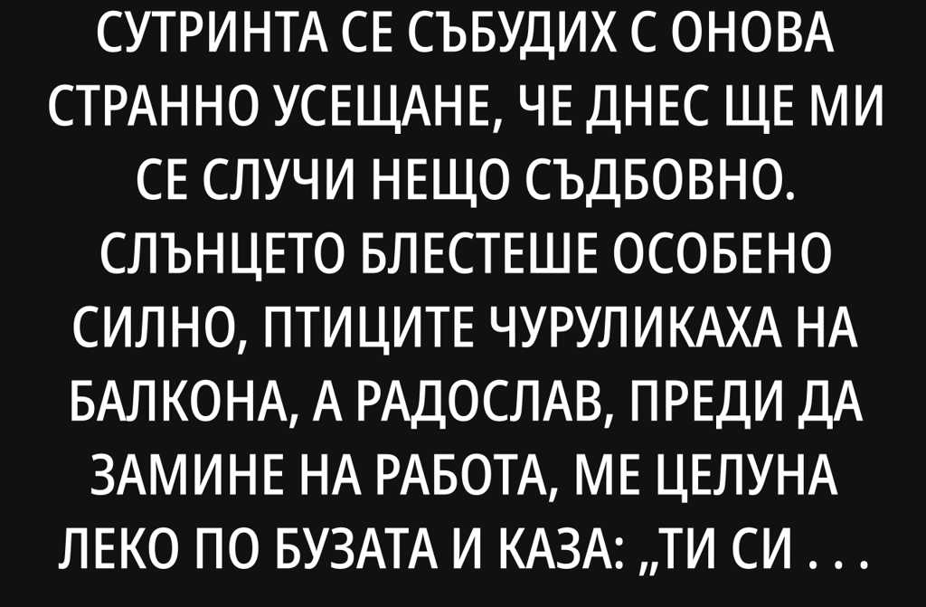 Сутринта се събудих с онова странно усещане, че днес ще ми се случи нещо съдбовно. Слънцето блестеше особено силно, птиците чуруликаха на балкона, а Радослав, преди да замине на работа, ме целуна леко по бузата и каза: Ти си най-добрата жена на света. Всичко си вървеше по реда си. Перфектно.
