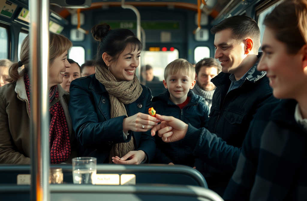 Автобусът беше препълнен с хора. Видях един млад мъж, който слушаше музика с големи слушалки, а eu го помолих да ни отстъпи мястото. Той се изправи веднага, а аз и синът ми седнахме. Синът ми дори му подаде едно локумче като благодарност. Момчето се смути и се усмихна.