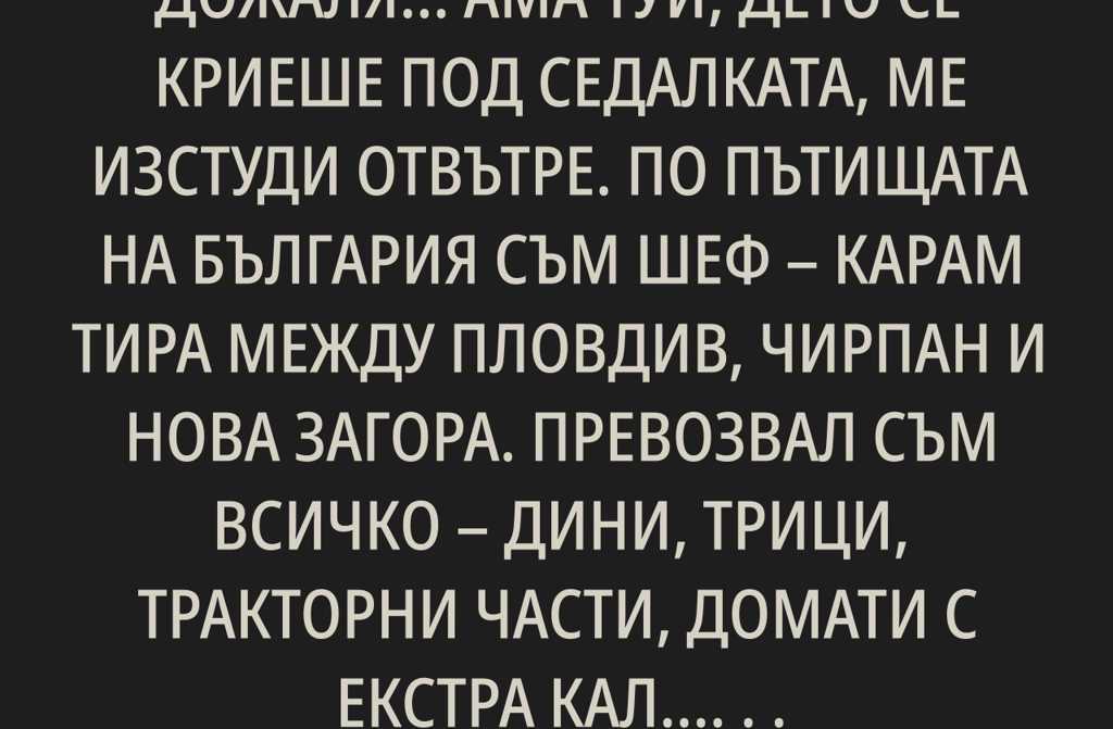 По пътищата на България съм шеф карам тира между Пловдив, Чирпан и Нова Загора.