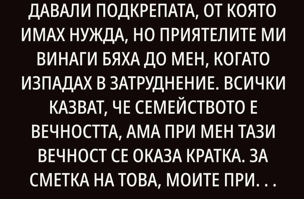 Родителите ми никога не ми дадоха подкрепата, от която се нуждаех, но приятелите ми бяха до мен във всички трудности. Въпреки че се казва, че семейството е завинаги, при мен не беше така. Приятелите ми винаги ме подкрепяха, даваха ми сила и ми помагаха точно когато имах най-голяма нужда.