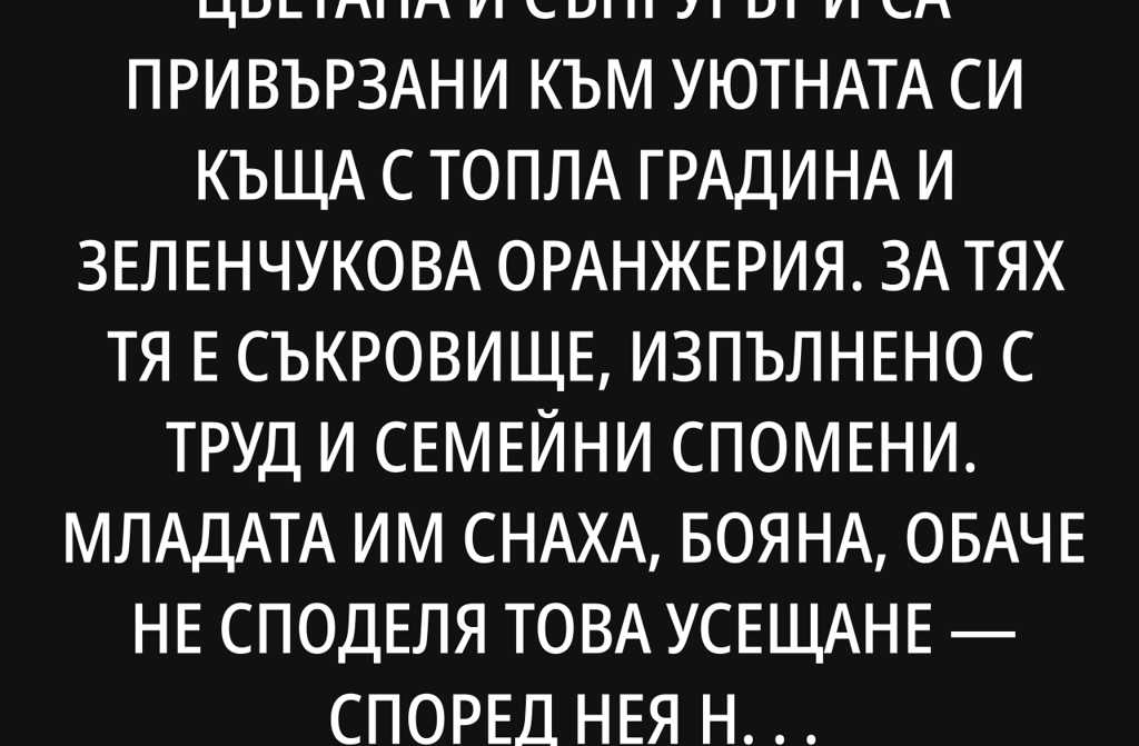 В малкото българско село, Цветана и съпругът ѝ са привързани към уютната си къща с топла градина и зеленчукова оранжерия. За тях тя е съкровище, изпълнено с труд и семейни спомени. Младата им снаха, Бояна, обаче не споделя това усещане според нея няма нищо за обичане тук. Няма удобства, банята е вън, всичко се поддържа на ръка, а работата никога не спира върху земята и в оранжерията. Въпреки това, Цветана и съпругът ѝ прекарват от април до октомври тук. Ако зависеше само от тях, те биха искали да останат и през зимата, макар да е ясно, че това изисква сериозна инвестиция в дома. “По-логично би било да почиват в някой курорт,” казва Бояна с досада.