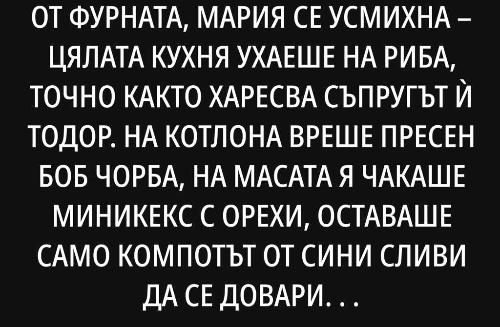 След като извади тава с баница от фурната, Мария се усмихна цялата кухня ухаеше на риба, точно както харесва съпругът ѝ Тодор. На котлона вреше пресен боб чорба, на масата я чакаше миникекс с орехи, оставаше само компотът от сини сливи да се довари. Това ще го направи, щом мъжът ѝ прекрачи прага.