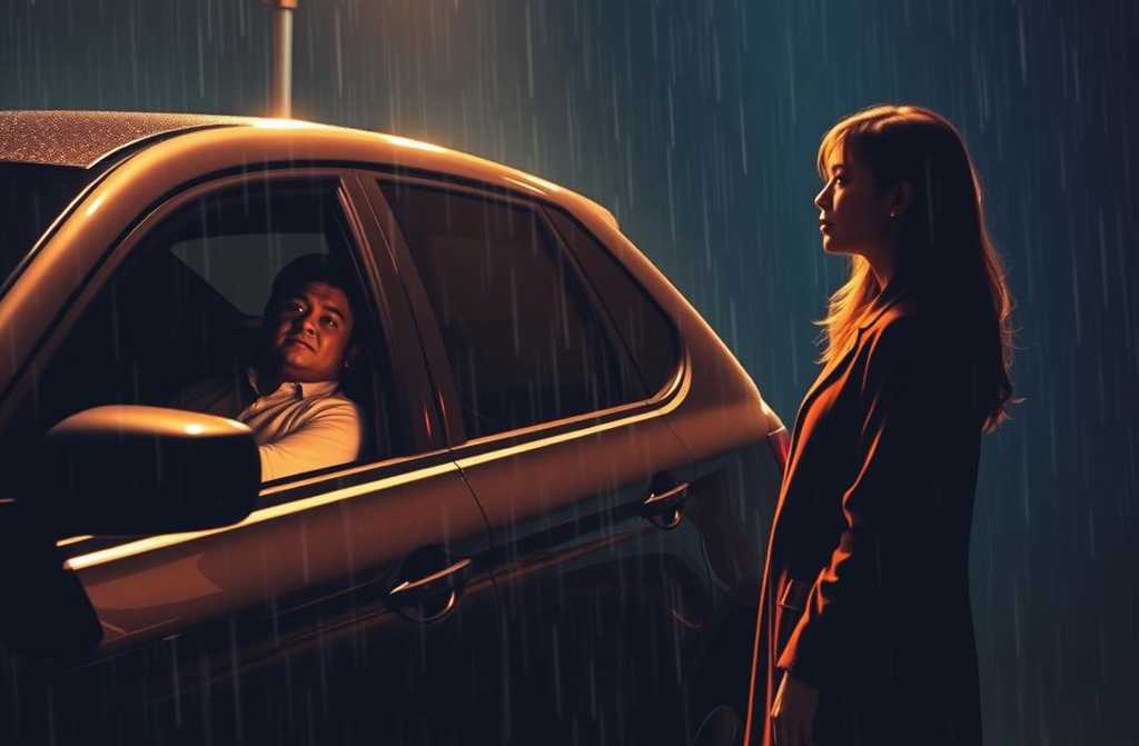 Дъждът усилваше, ветровите стъкла едва се справяха. Красимир продължаваше да кара, водейки вътрешен диалог. Реши да направи още една обиколка, да зареди и да се прибере. На светофара спря. Внезапно погледът му засече женска фигура под дърво. Апрелските листа не я пазеха — тя бе мокра до кости, стоиКрасимир спусна прозореца и извика: „Качвайте се, навън е студено!“