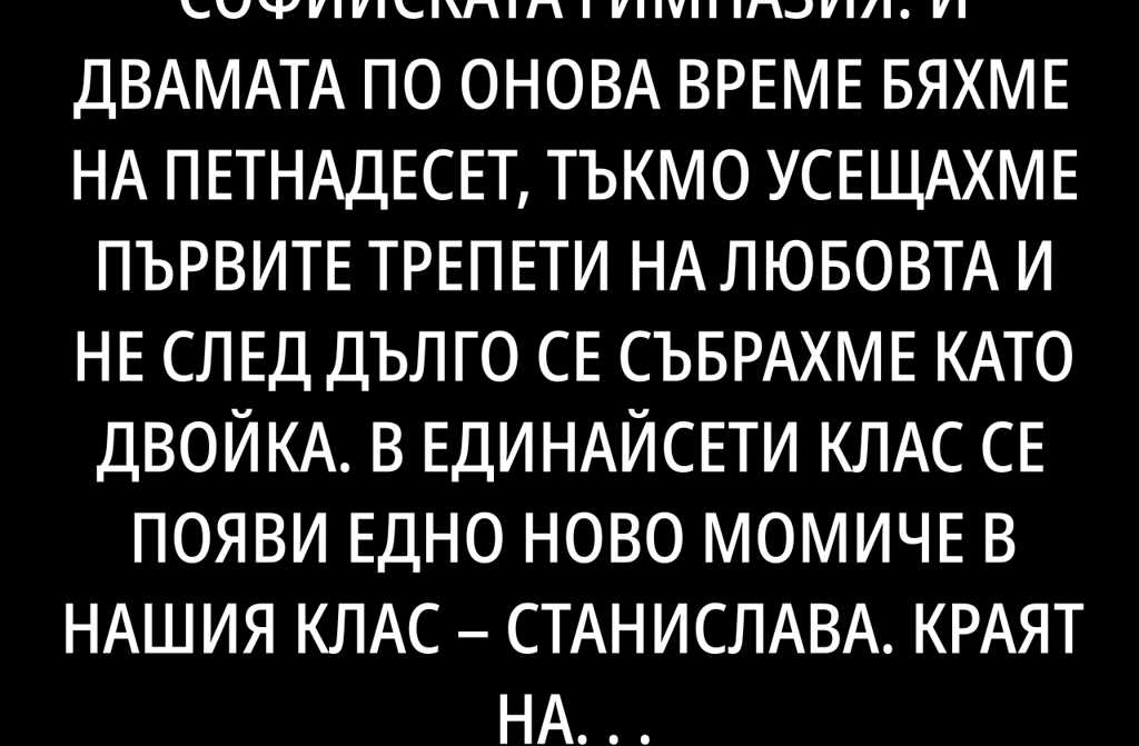 Запознах се с него в Софийската гимназия. И двамата по онова време бяхме на петнадесет, тъкмо усещахме първите трепети на любовта и не след дълго се събрахме като двойка. В единайсети клас се появи едно ново момиче в нашия клас Станислава. Краят на учебната година промени всичко. От невнимание той си беше забравил телефона в якето и без да искам, видях как си чатят с нея. В този момент много неща в ума ми се подредиха като пъзел: винаги тя първа тичаше при него с всяка драма. Аз вярвах, че са просто приятели.